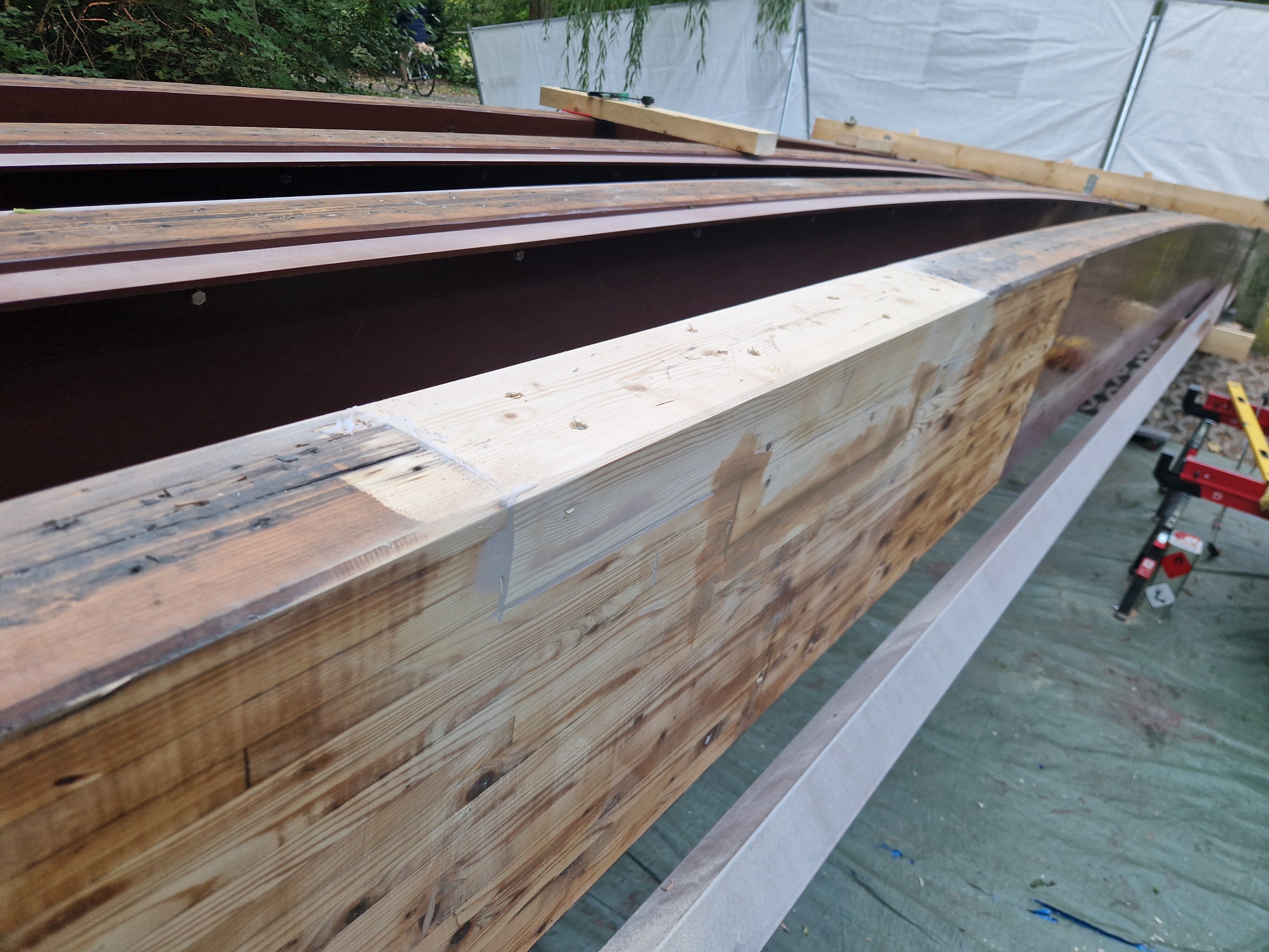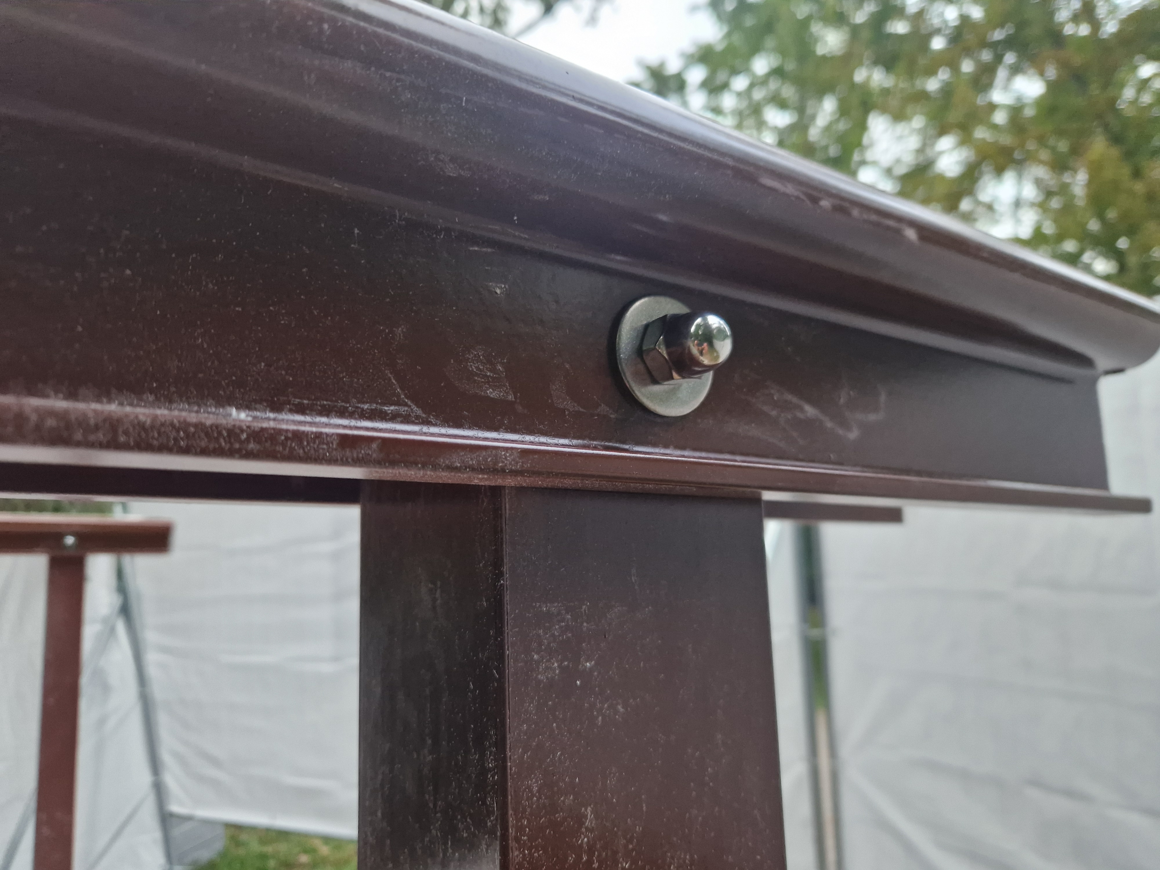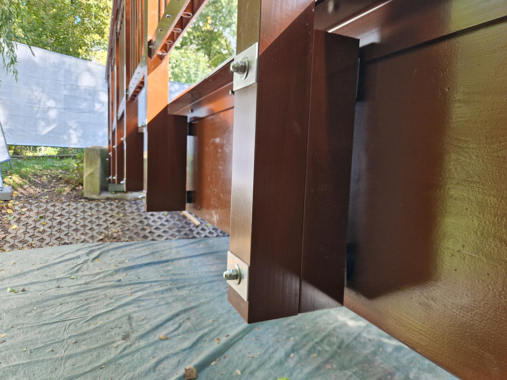 The bridge's original structure consisted of Azobe (Tropical hardwood species) for the railing and support beams, while the deck was made of oak wood. Over time, the support beams were replaced with galvanized steel beams, and after 30 years, the deck was swapped out with a FRP deck. However, some parts of the bridge's railing showed severe weathering damage and were replaced with a new FRP railing. Additionally, the longitudinal beams, made of laminated spruce, had been affected by rot and insect infestation, requiring professional repairs and protection with a new coat of paint and a structural wood protection system.