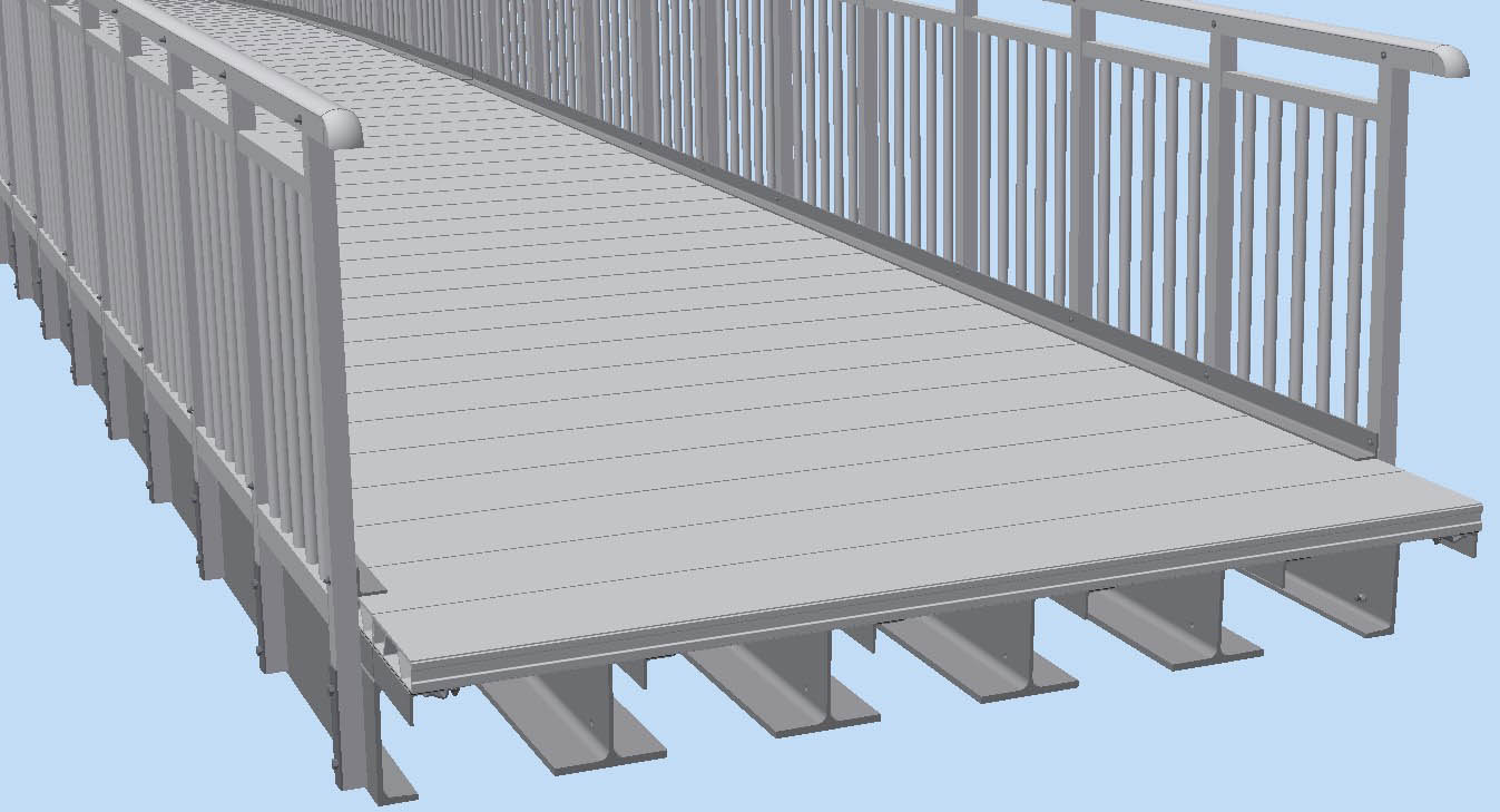 The deck and railings of the bridge are made of fiberglass, which, in addition to being lightweight, is also durable and slip-resistant. The supporting structure is made of steel.