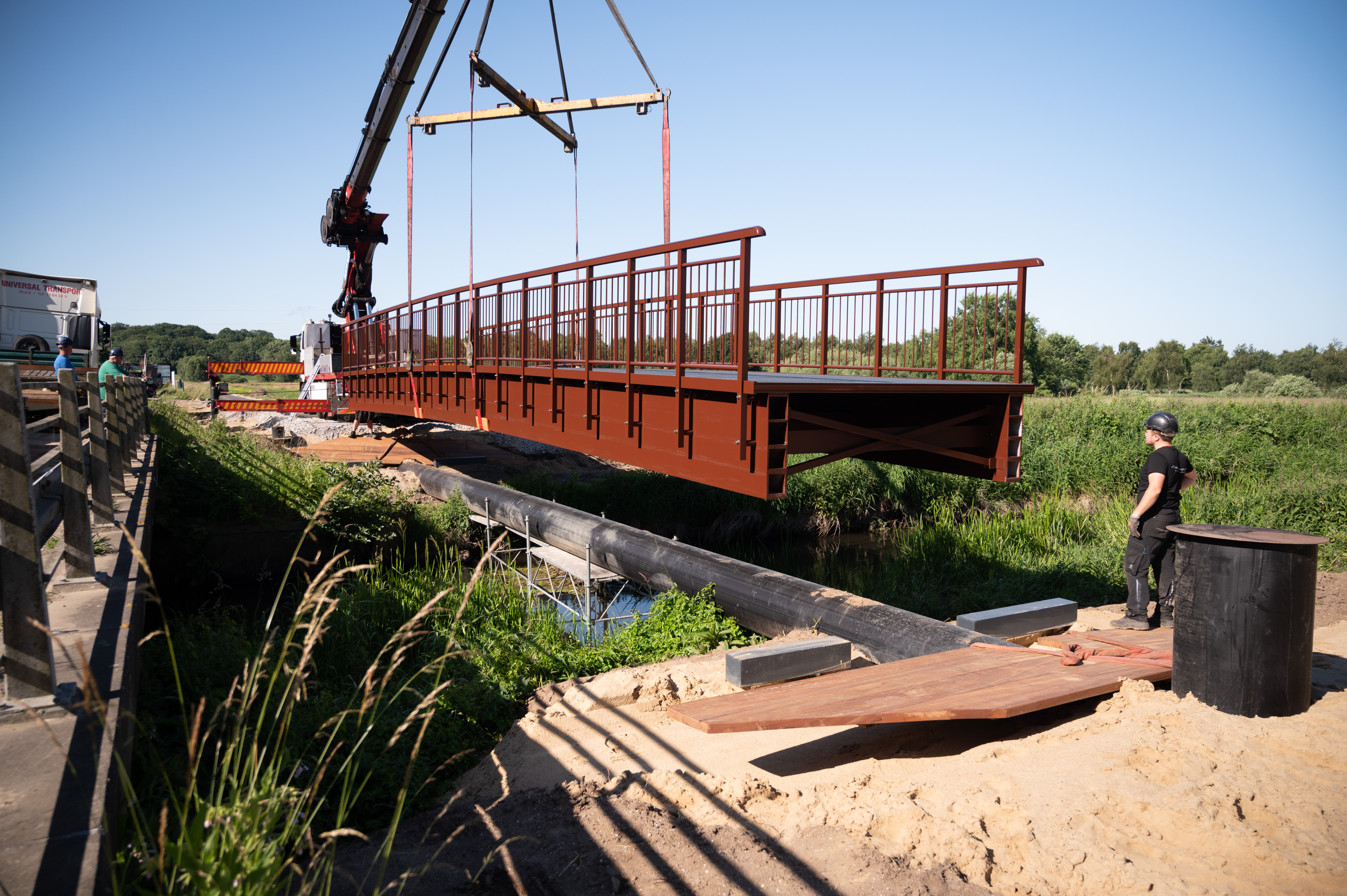 The installation of the bridge was carried out with military precision. The main contractor, Kaj Bech A/S, began the work in June with the construction of foundations, concrete pillars, and braces. The bridge itself was manufactured by JTN Steel in Esbjerg and delivered as a special transport to Herning, where it awaited placement in HI-Park before being lifted into place by a massive mobile crane.