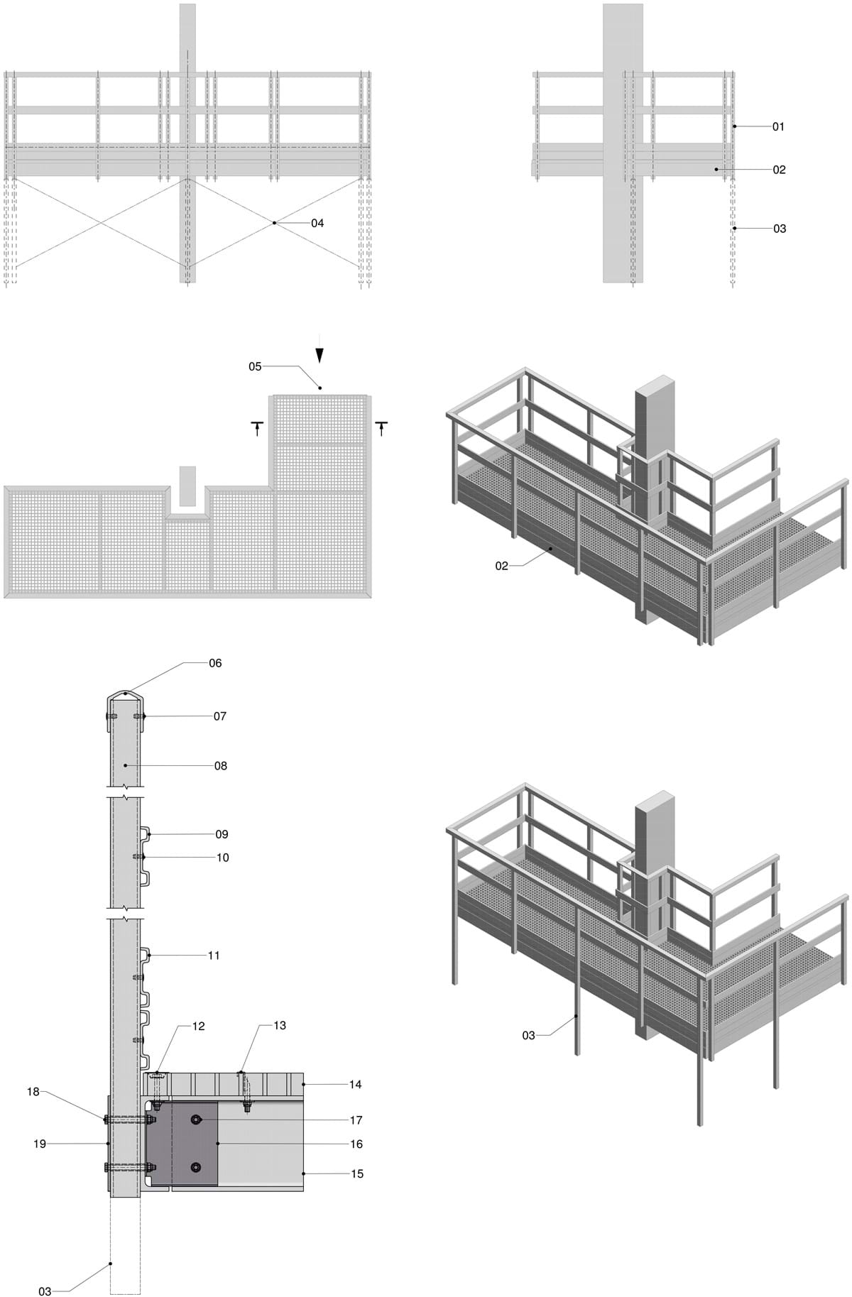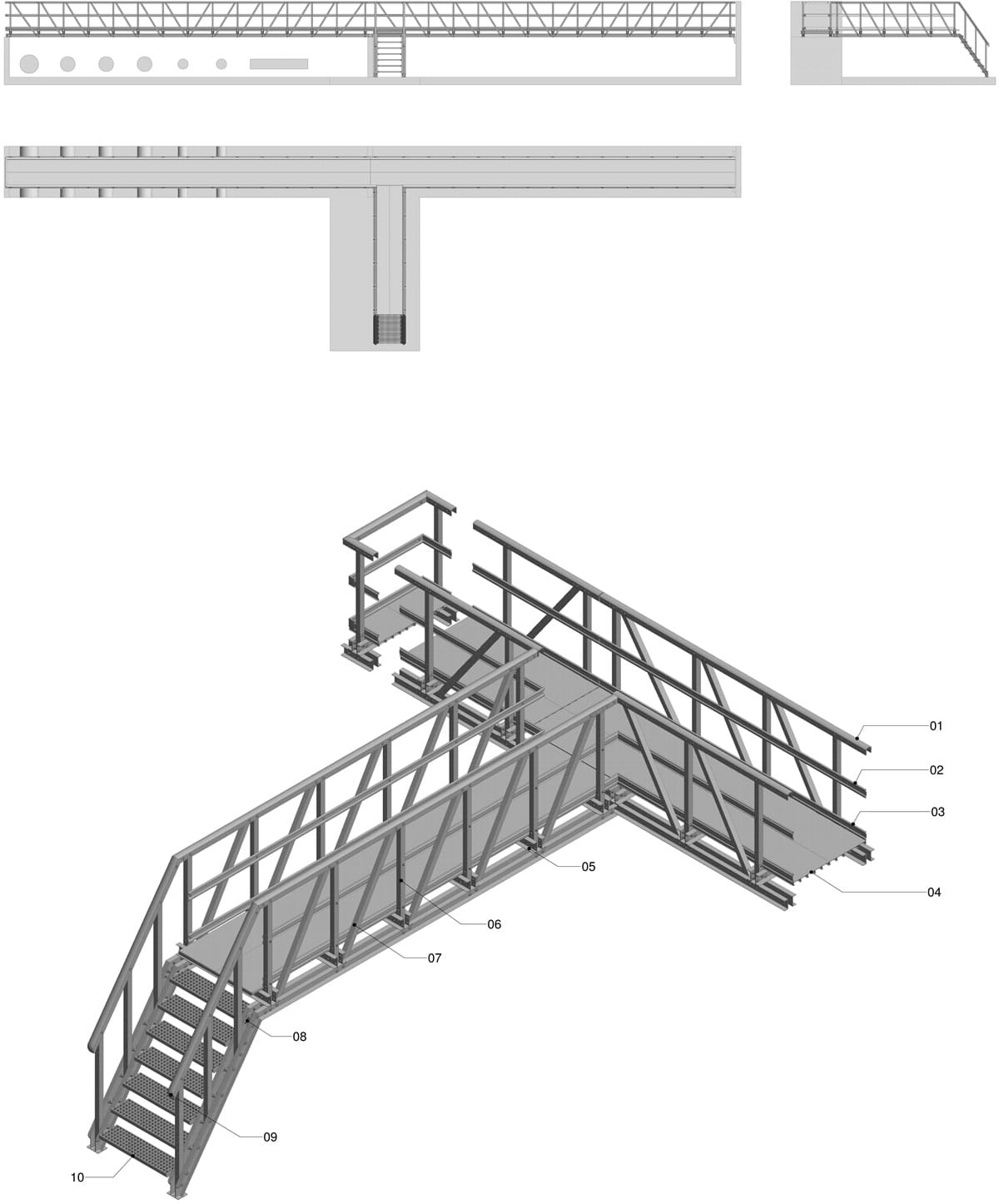 Die folgende Abbildung des Zugangsweges ist eine Fachwerkkonstruktion mit einer Spannweite von bis zu 15 Metern. An die Zugänge angebunden ist eine kleine Treppe. Alle Konstruktionen sind nach EN 14121 ausgelegt; 1-3