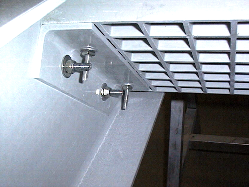 GFK-Plattform, angebunden an eine große Stütze aus stehenden quadratischen Hohlprofilen. Für den Gehweg kann eine Vielzahl von GFK-Roste oder Planken verwendet werden.