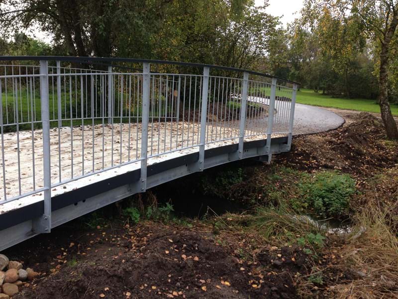Zum Ausbau des Wegenetzes im Umfeld einer Neubausiedlung plante die Gemeinde Ikast-Brande eine Brücke über die Bordinger Aue. Bedenken bereitete den Planern von Anfang an die Frage, wie man die attraktive Natur am Wasserlauf bewahren konnte. Als optimale Lösung erwies sich eine Hybridbrücke, die harmonische Optik mit Haltbarkeit und Kosteneffizienz vereint: Tragwerk und Geländer aus Stahl sowie Brückendeck und Handläufe aus GFK.