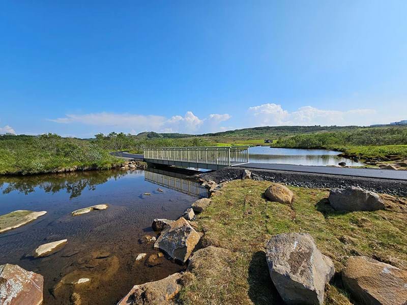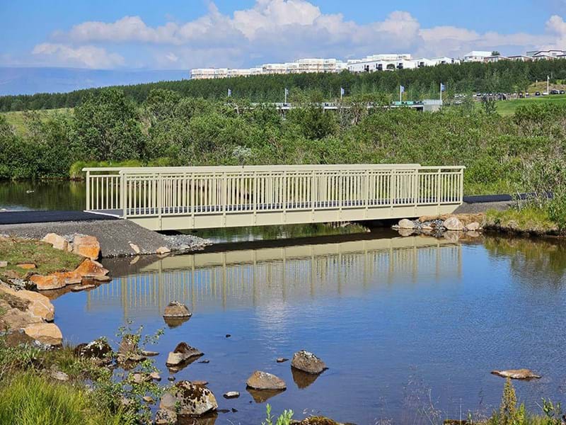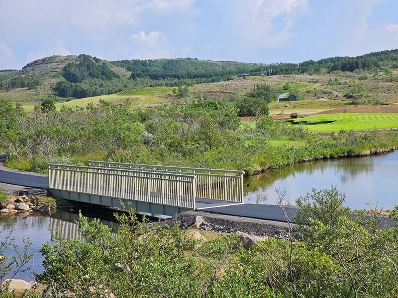 Die neue GFK-Brücke von Fiberline auf dem Golfplatz von Reykjavik hat eine Spannweite von 12 Metern, ist wartungsfrei und zudem kostengünstiger als Alternativen aus Holz.
