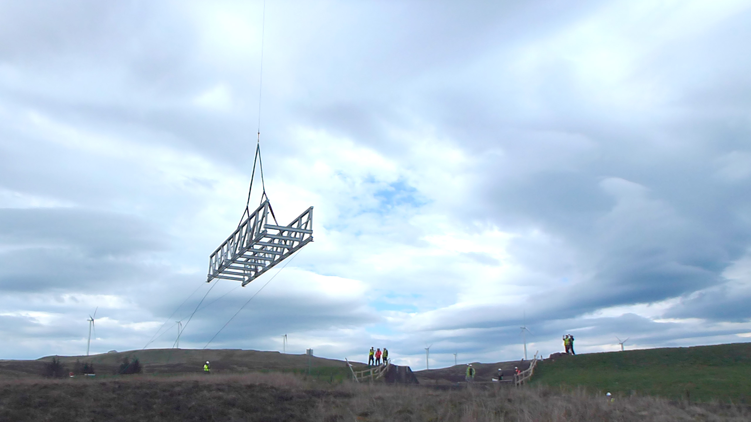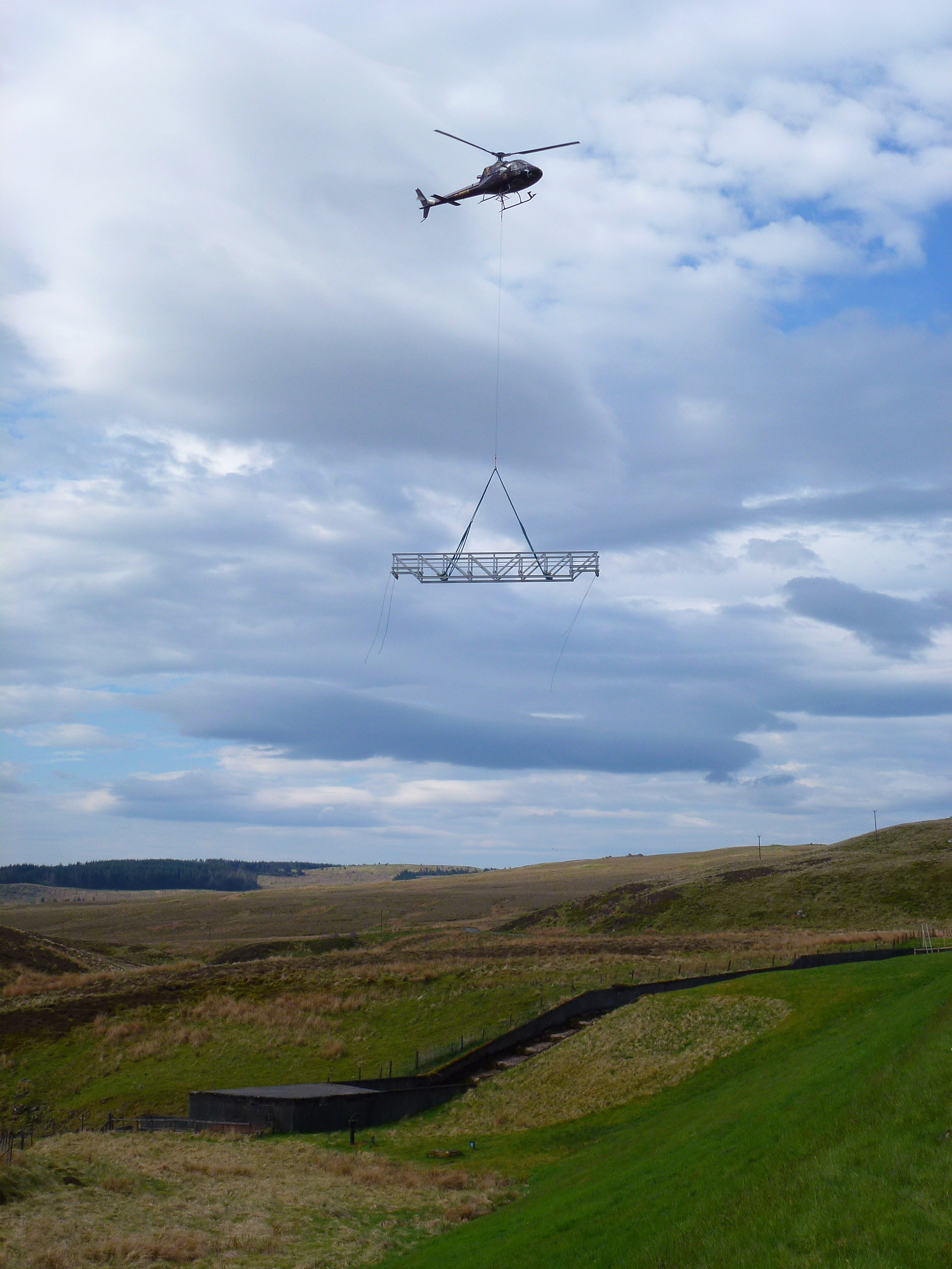 CTS-Direktor Simon Newby: "Weder LkW-Transport noch Kraneinsatz waren mÜglich, also wählten wir den Helikopter-Einsatz als eine auch fßr unseren Kunden wirtschaftlich vertretbare LÜsung. Auf diesem Hintergrund optimierten wir das Gewicht der Konstruktion so, dass die vormontierten Traversen von einem relativ kleinen Hubschrauber mit Einfachrotor installiert werden konnten."