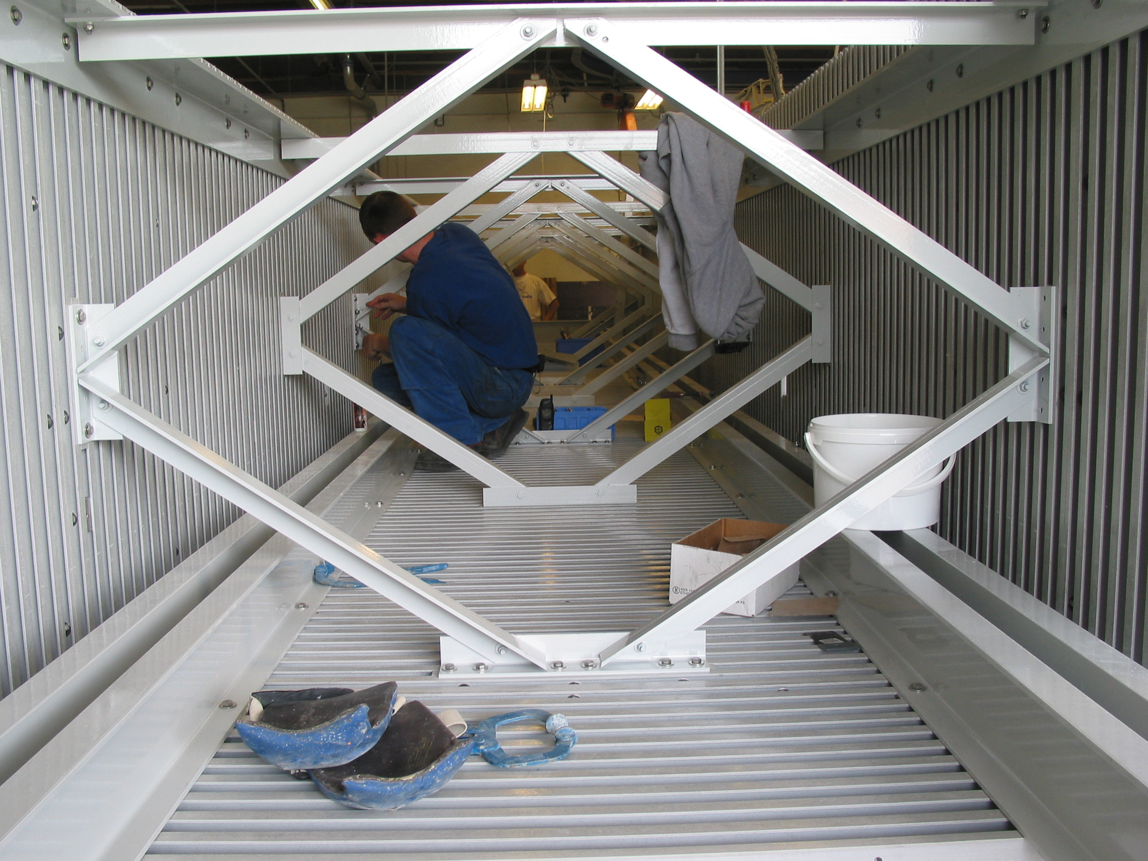 Mit ihrem niedrigen Gewicht lässt sich die Brßcke ohne zusätzliche Verstärkungen an der Dachkonstruktion befestigen, so dass sie unter der Decke hängen und bei Bedarf abgesenkt werden kann. Leichtbau mit hoher Festigkeit und Steifigkeit.