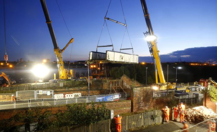 Thornaby jest ruchliwą stacją, co oznaczało, że prace montażowe musiały być wykonane w krótkim czasie zaledwie sześciu godzin, bez przerw w ruchu pociągów. Również w tym przypadku niewielka masa pokładów mostowych była niewątpliwą zaletą, ponieważ pokłady można było podnosić ręcznie i obrabiać na miejscu montażu przy użyciu zwykłych narzędzi ręcznych.