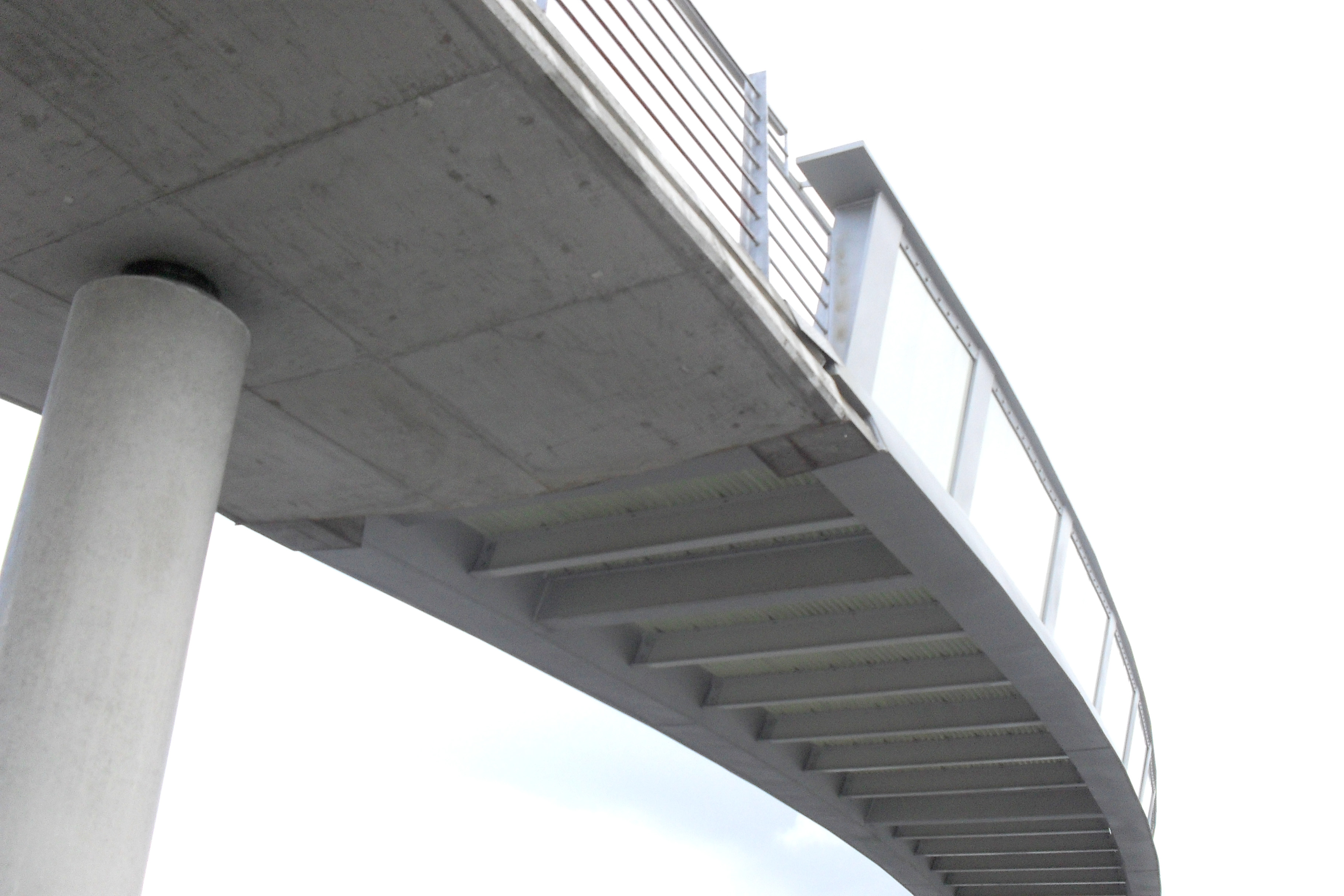 Hybridbro med Fiberline HD-plankor, genomskinlig Längd: cirka 60 m Bredd cirka 4 m Belastning: gångbro