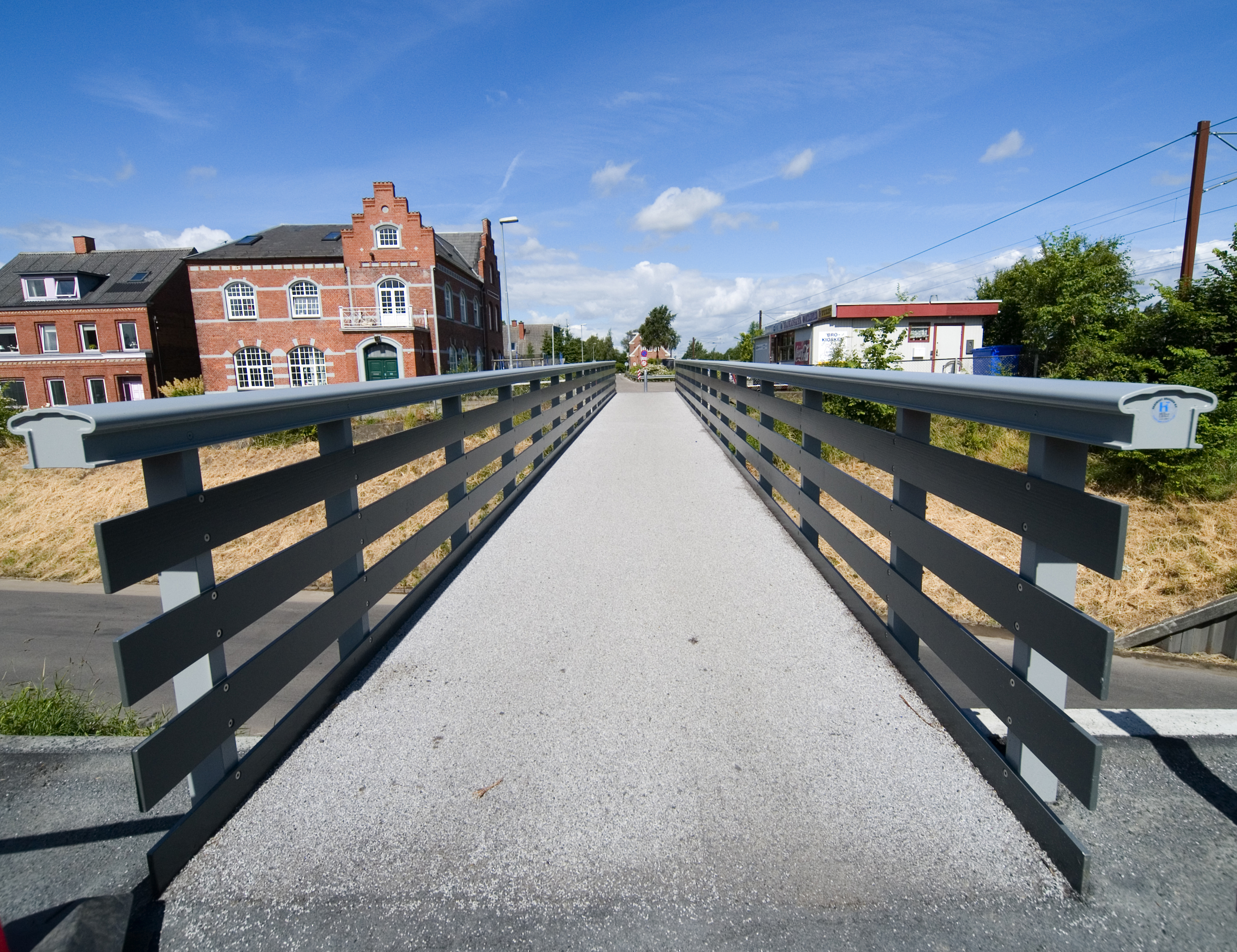 Fiberlines kompletta glasfiberbroar använder endast material tillverkat av Fiberline Buillding Profiles A / S. Huvudbalkarnar är från stora U- och I-profiler och beläggningen är gjord av HD-planka. Räcket är vårt vanliga broräcke, också helt tillverkat av FRP.